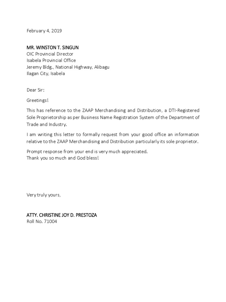 Request Letter For Company Registration